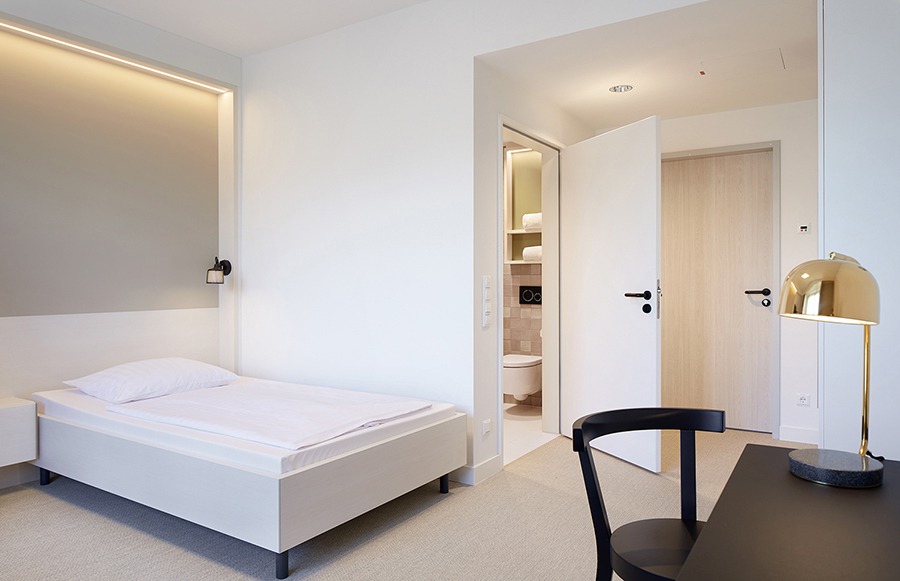 Gestalterische Klarheit und der bewusste Verzicht auf dekorative Elemente unterstreichen den puristischen Stil und die sachliche Anmutung der Räume.