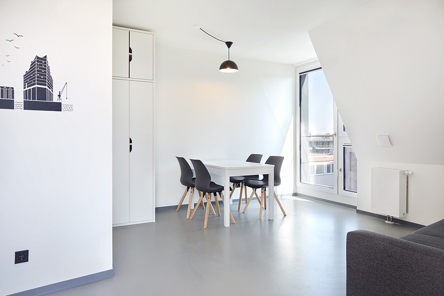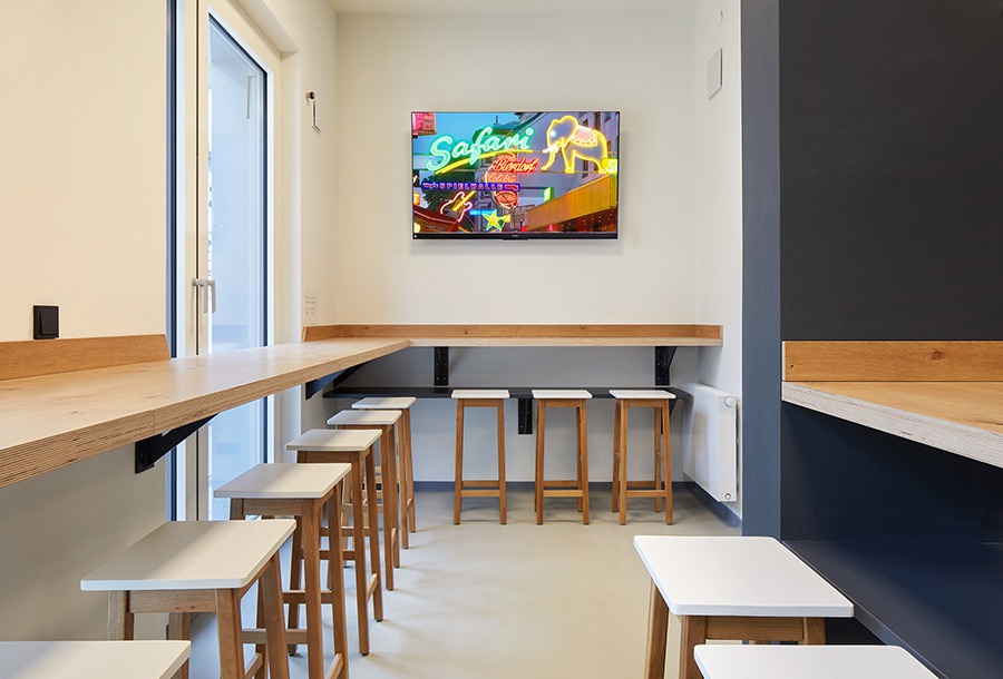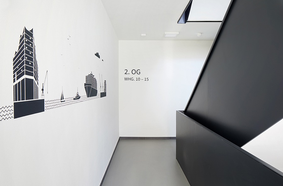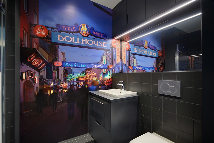 Großflächige Farbfotos mit Bezug zu St. Pauli, dem Hafen und der Reeperbahn finden sich im Treppenhaus, im Gemeinschaftsraum und auch in den einzelnen Apartments wieder.