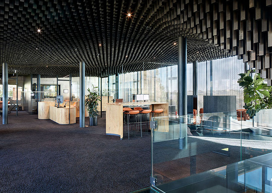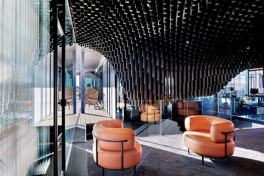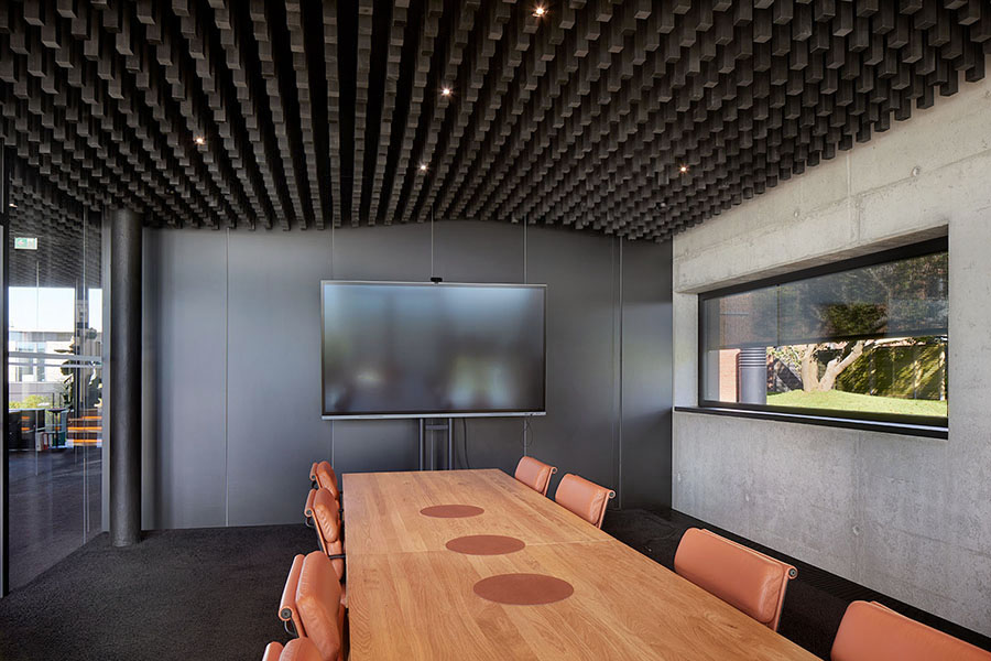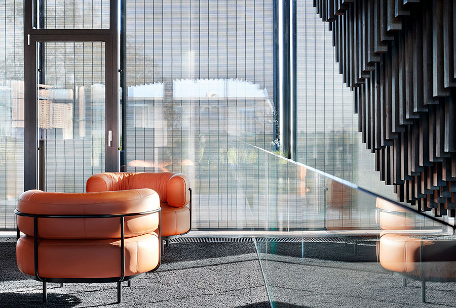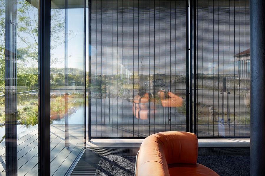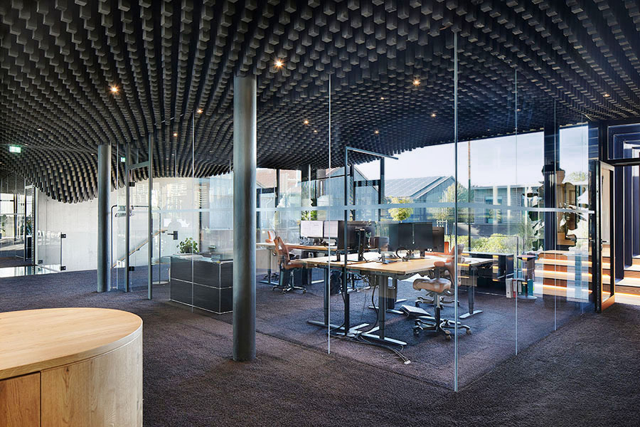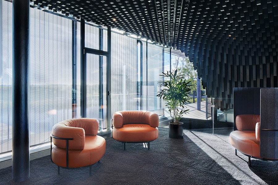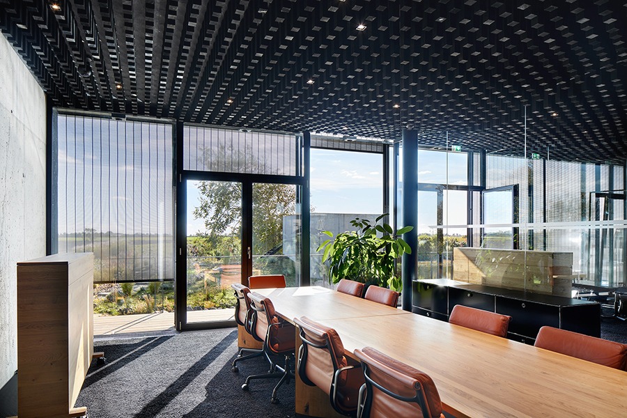 Ein besonderes Highlight bildet die parametrisch entwickelte Akustikdecke, die dem Innenraum eine unverwechselbare Atmosphäre verleiht. Auch der außenliegende Metallbehang s_enro der MHZ Hachtel GmbH & Co. KG trägt wesentlich zum Gesamtkonzept bei: Als bewegliches Sonnenschutzsystem verbessert er nicht nur das Raumklima und den Nutzerkomfort, sondern fungiert zugleich als prägendes Gestaltungselement der Fassade. Damit wird er zu einem integralen Bestandteil der architektonischen Identität und ergänzt das energetische Konzept des Gebäudes auf überzeugende Weise.