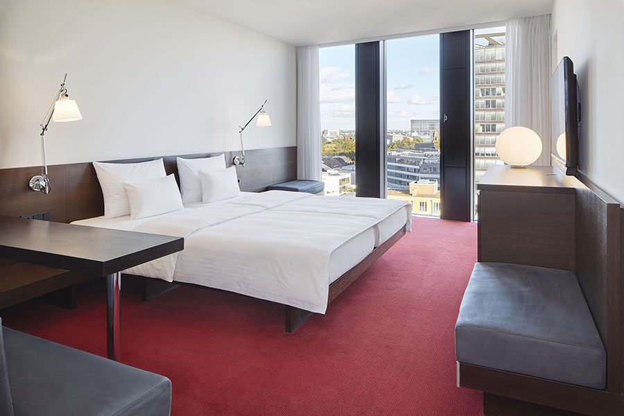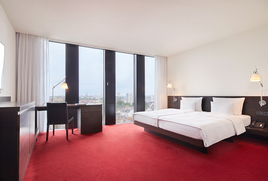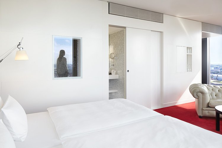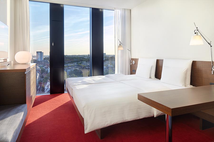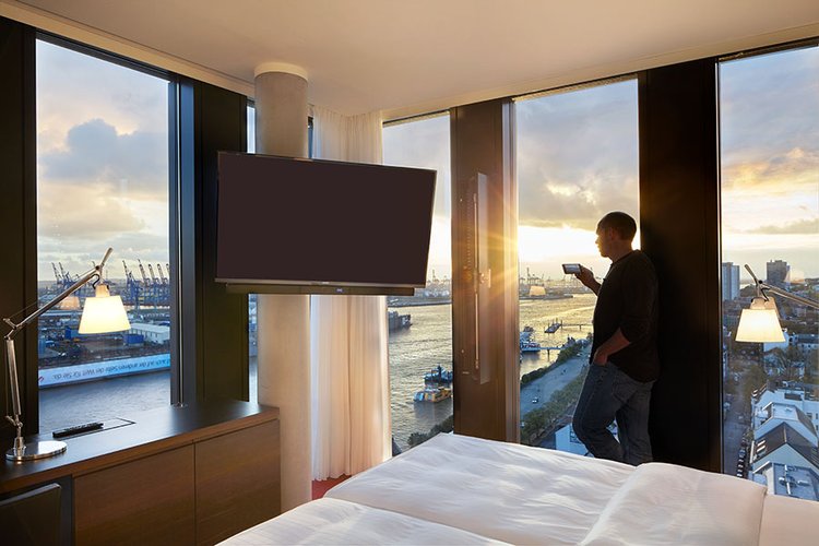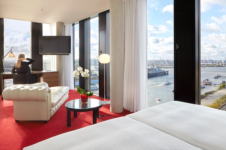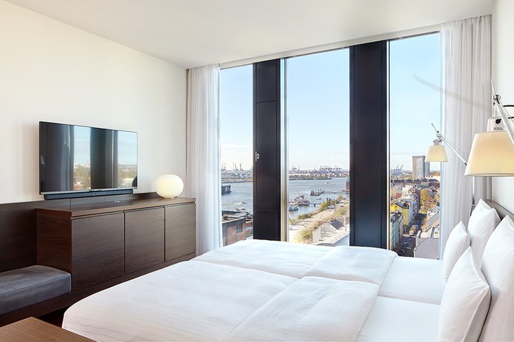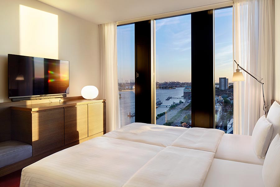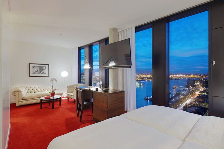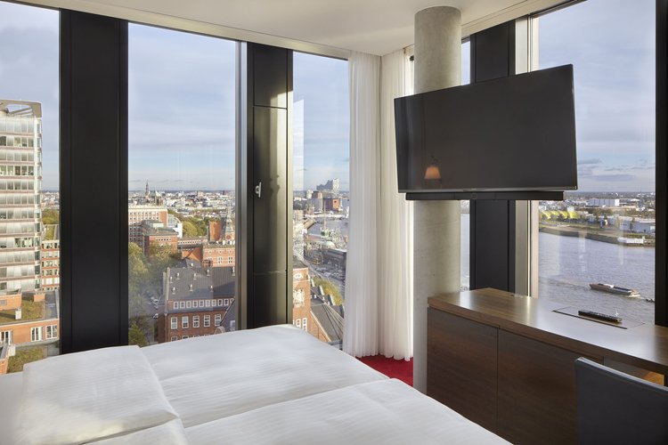 Mit 327 Zimmern und Suiten auf 20 Etagen bietet das Hotel einen atemberaubenden Blick auf den Hamburger Hafen, die Elbe und die Stadt. Die Zimmer zeichnen sich durch bodentiefe Fenster und modernes Design aus. Im 20. Stockwerk befindet sich die Skyline Bar 20up, die einen spektakulären Panoramablick bietet.