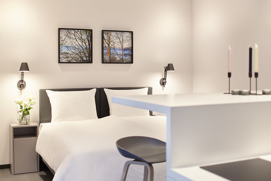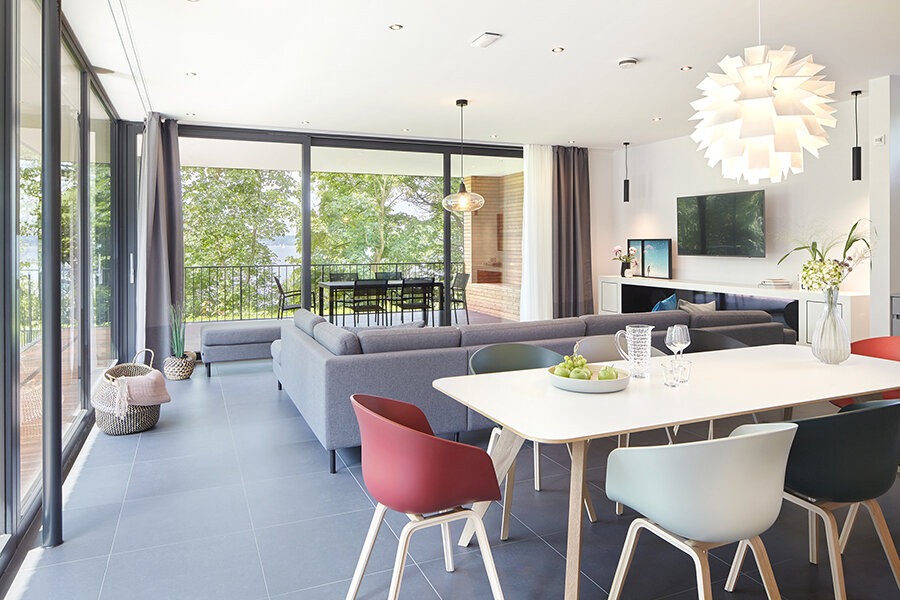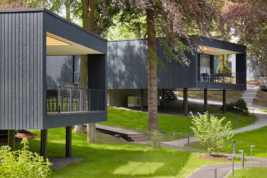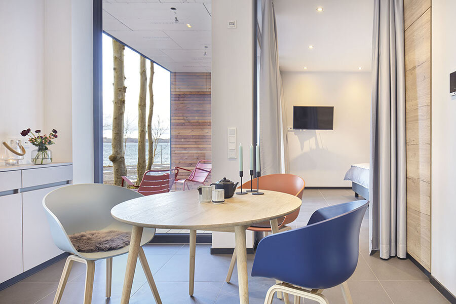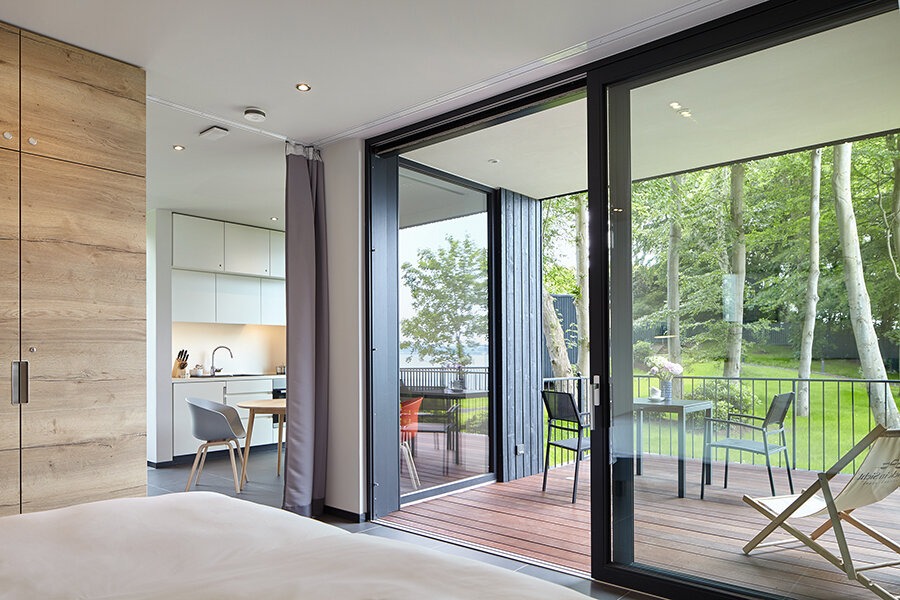 Die Glück in Sicht Ostseelodges liegen auf einem weitläufigen Gelände direkt an der Flensburger Förde und fügen sich harmonisch in den teils über hundert Jahre alten Baumbestand ein. Das Konzept der Lodges vereint moderne Architektur mit der natürlichen Umgebung: Großzügige Fensterflächen, natürliche Materialien und klare Linien schaffen helle, offene Räume mit Blick auf Bäume, Wege und Wasser. Die Anlage setzt auf eine sensible Integration in die bestehende Landschaft: Wege, Baumgruppen und Sichtachsen wurden bewusst erhalten, sodass die Architektur mit der Natur verschmilzt. Die Lodges wurden auf Stelzen errichtet, um den alten Baumbestand zu erhalten. Die Lodges sind flexibel im nordischen Design gestaltet und bieten Platz für unterschiedliche Nutzungskonstellationen Die Glück in Sicht Ostseelodges in Glücksburg wurden von den KLM Architekten Leipzig GmbH entworfen und realisiert. Der Bauherr war die Glück in Sicht Ostseelodges GmbH & Co. KG