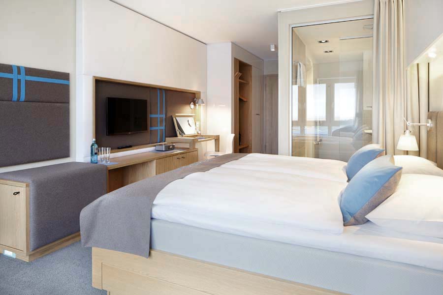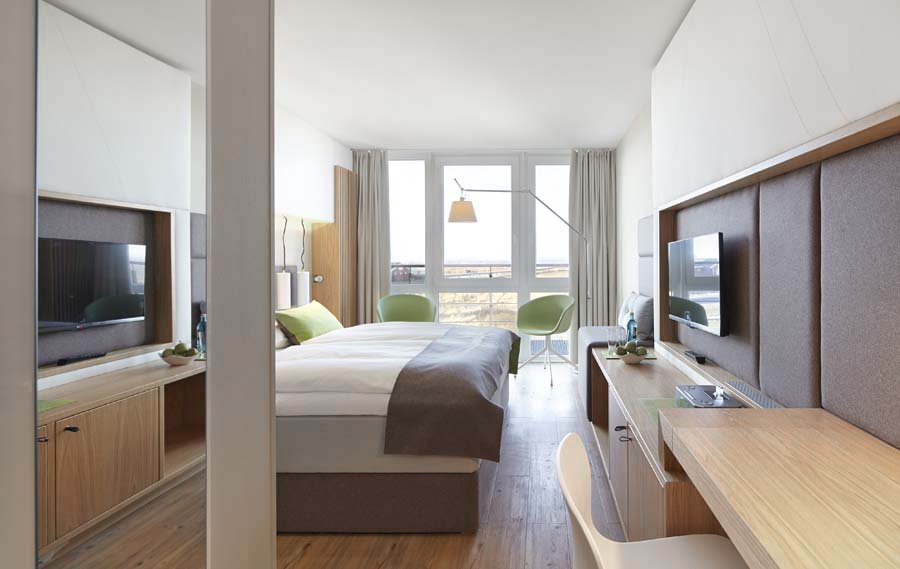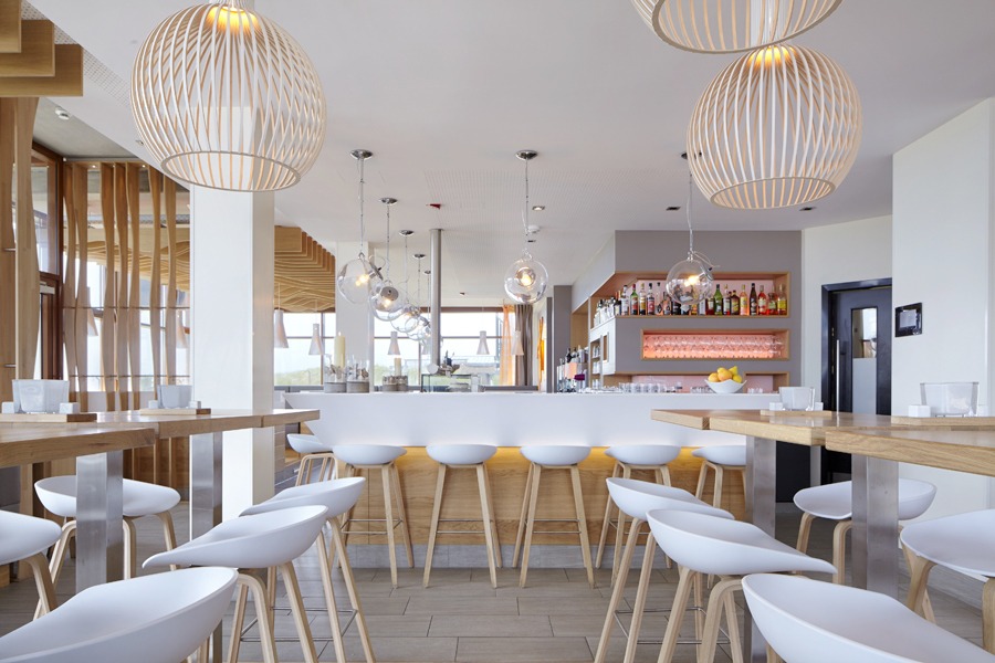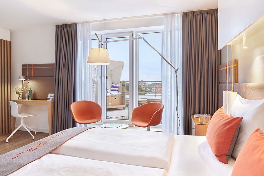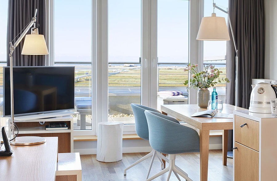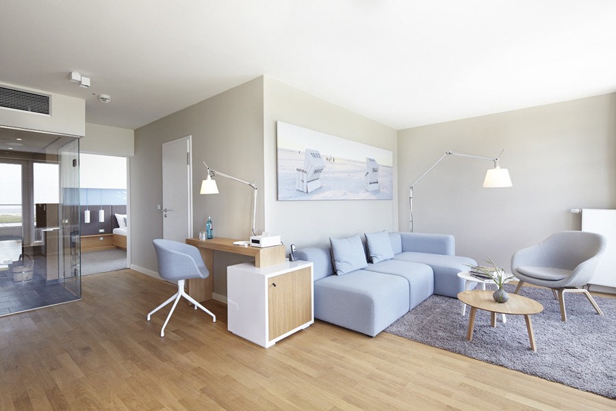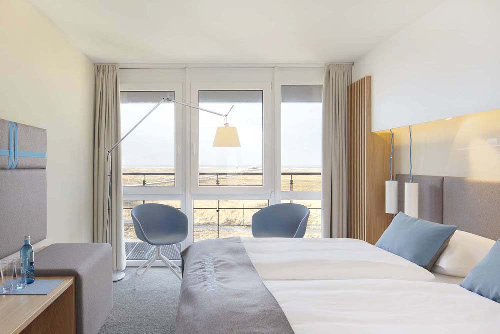 Akzentfarben in Blau und Beige sowie Details wie Strandbilder und Seilstrukturen nehmen Bezug auf das Meer und die Küste. Das Design legt großen Wert darauf, die Natur in den Raum zu integrieren. Besonders beeindruckend ist der weite, offene Charakter des Resorts, der den Blick auf das Meer oder die Dünenlandschaft freigibt und so das Gefühl von Weite und Freiheit verstärkt.